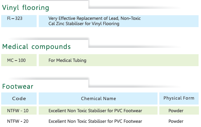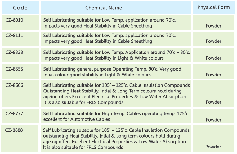 Calcium zinc stabilizers (Ca-Zn) are new generation stabilizers which have gained good acceptance in PVC cables, pipes, fittings, profiles, floorings, footmattings and other allied industries.
